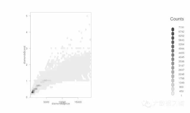 >a=hexbin(diamonds$price,diamonds$carat,xbins=40)
