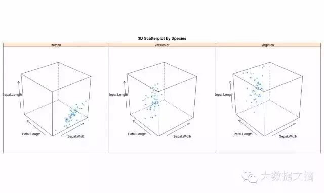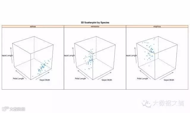 >cloud(Sepal.Length~Sepal.Width*Petal.Length|Species, main="3D Scatterplot by Species")