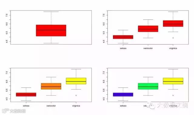 在下面的例子中,我在屏幕上显示了4个图。通过使用~符号,我可以将(萼片的长度)的伸展是如何跨各种类别(的物种)进行可视化。我在最后的两个图中演示了调色板。调色板是一组颜色,用来使图标更有吸引力,而且能帮助在数据中创建醒目的区别。