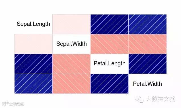 > corrgram(iris)