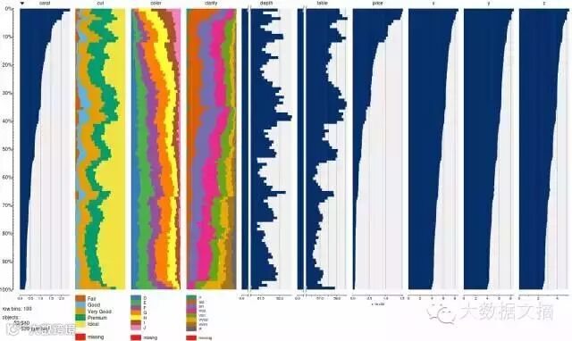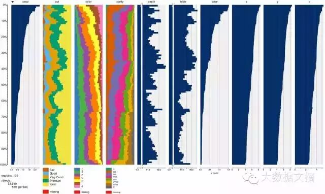 您可以使用tabplot包中的tableplot功能,快速汇总大量数据