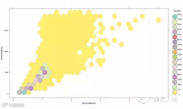 >hexbinplot(diamonds$price~diamonds$carat, data=diamonds, colramp=rf)
