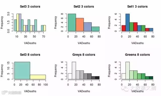 要了解更多关于R语言中调色板的使用,请参看http://decisionstats.com/2011/04/21/using-color-palettes-in-r/
