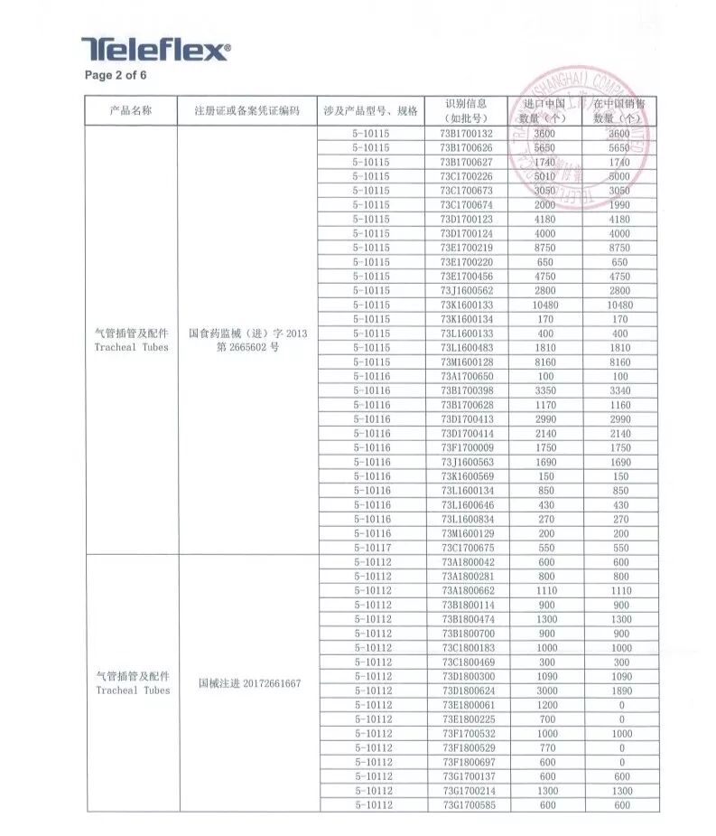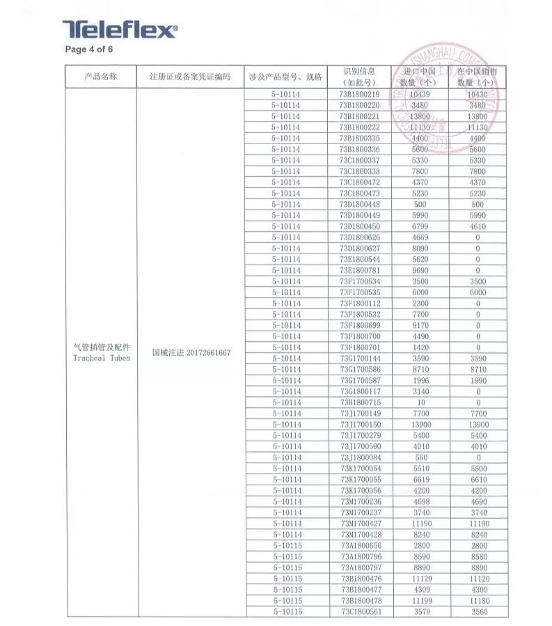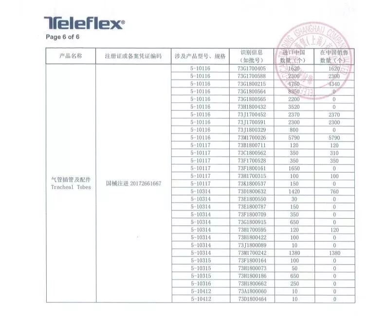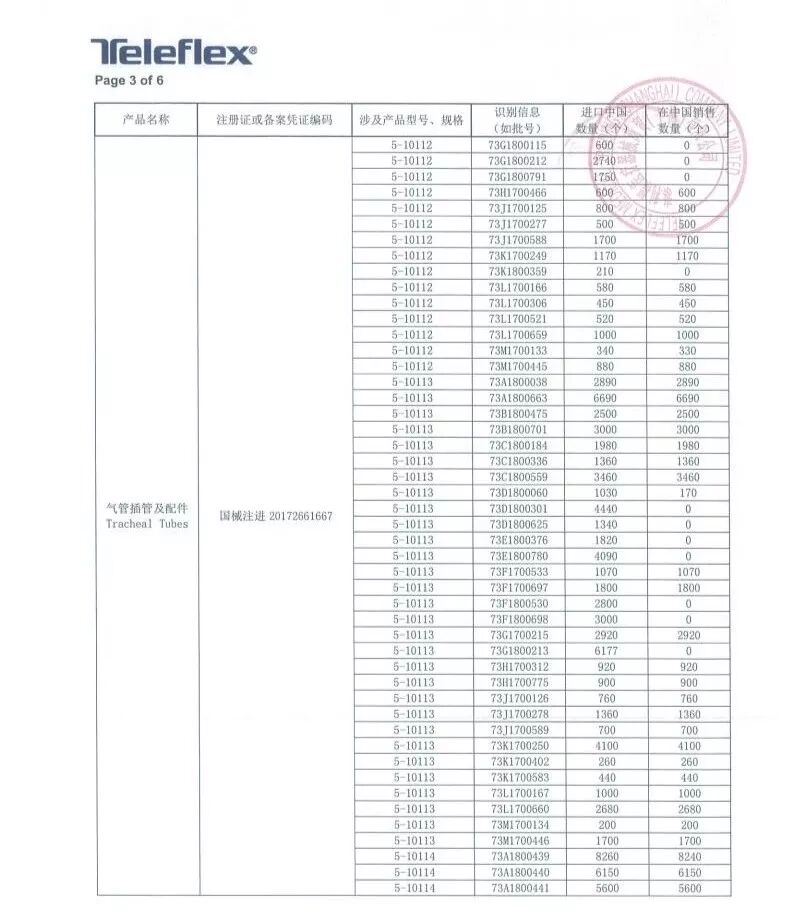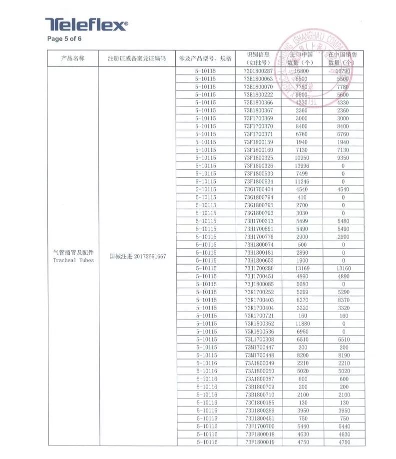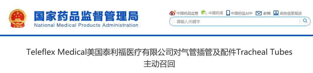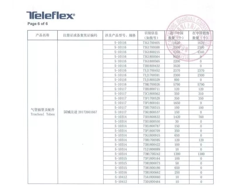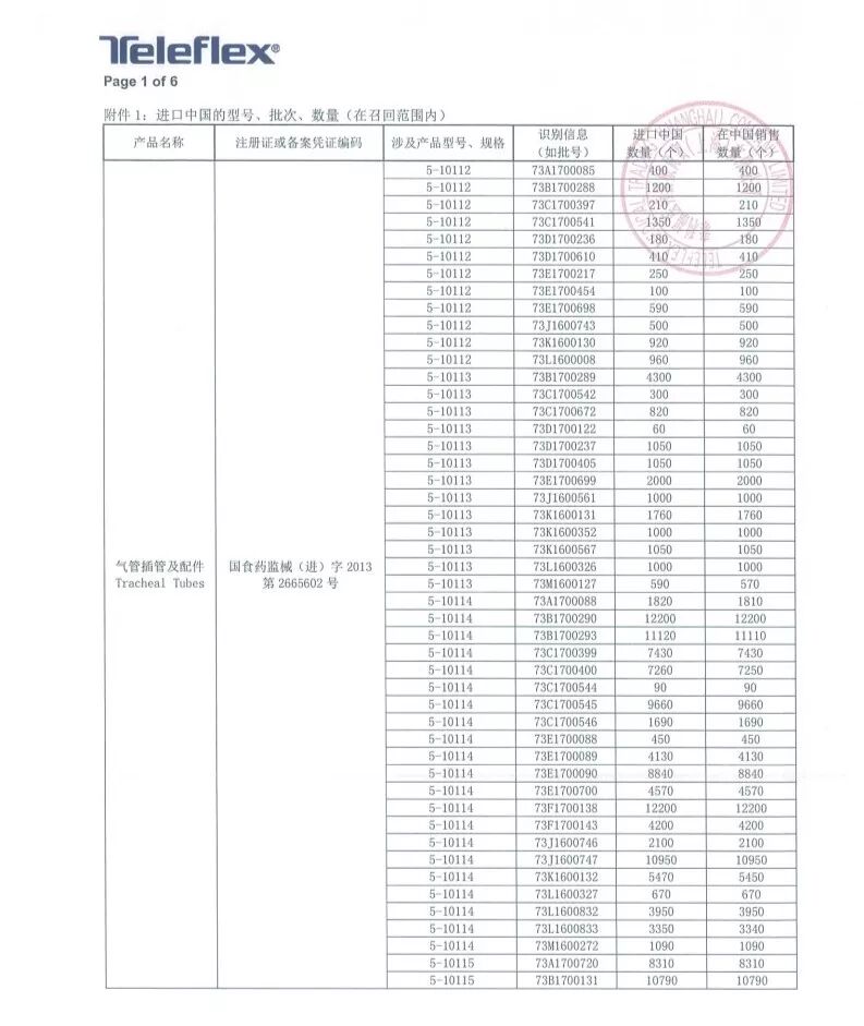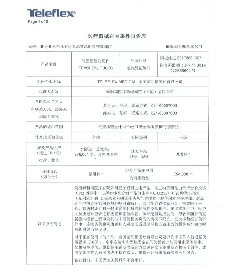 8月6日,泰利福医疗器械商贸(上海)有限公司报告,由于涉及产品可能存在特定批次的15毫米希尔顿连接头从气管插管上脱落的问题,生产商Teleflex Medical美国泰利福医疗有限公司对气管插管及配件Tracheal Tubes(注册证编号:国械注进20172661667、国食药监械(进)字2013第2665602号)主动召回。召回级别为一级,在中国销售数量754030个!