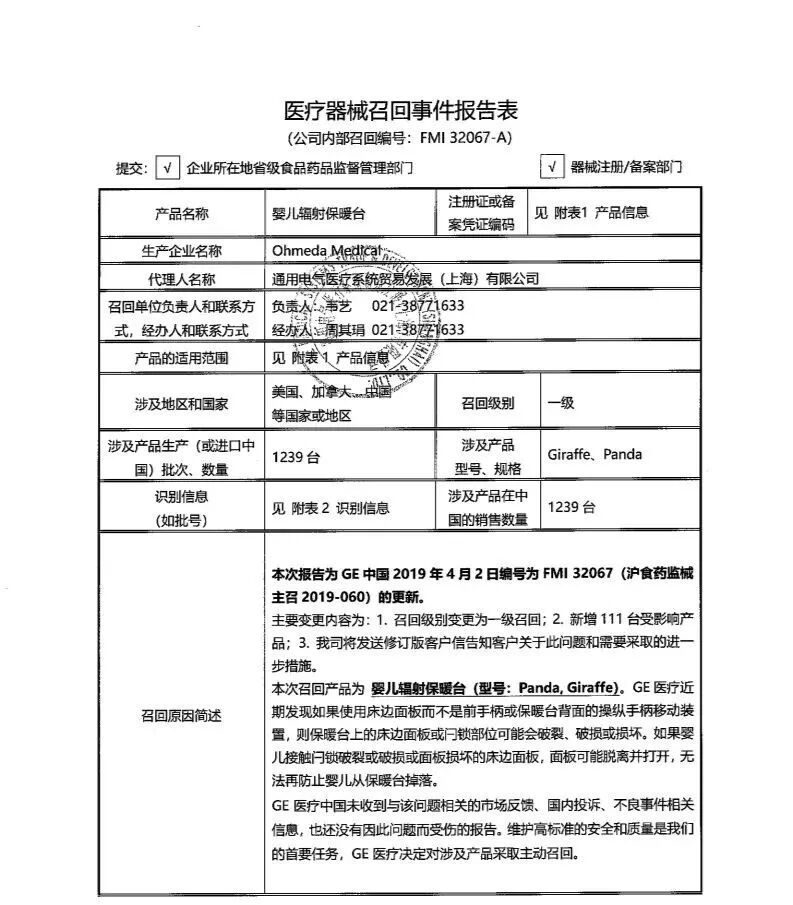 不止泰利福,通用电气医疗系统贸易发展(上海)有限公司报告,由于涉及产品可能存在保暖台床边面板或闩锁部位可能破裂的问题,生产商Ohmeda Medical.对婴儿辐射保暖台(注册证编号:国械注进20153540985、国食药监械(进)字2010第3543187号、国械注进20153540683、国食药监械(进)字2010第3543186号)主动召回。召回级别为一级,涉及产品在中国销售数量1239台!
