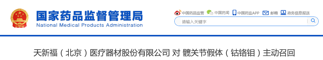天新福(北京)医疗器材股份有限公司 对 髋关节假体(钴铬钼)主动召回 ,天新福(北京)医疗器材股份有限公司 报告,由于 在国家医疗器械抽验中发现该批次股骨球头锥连接的锥角超过企业技术要求中允许的公差范围等原因,天新福(北京)医疗器材股份有限公司 对其生产的 髋关节假体(钴铬钼)(注册或备案号:国械注准20153462156)主动召回。召回级别为三级 。