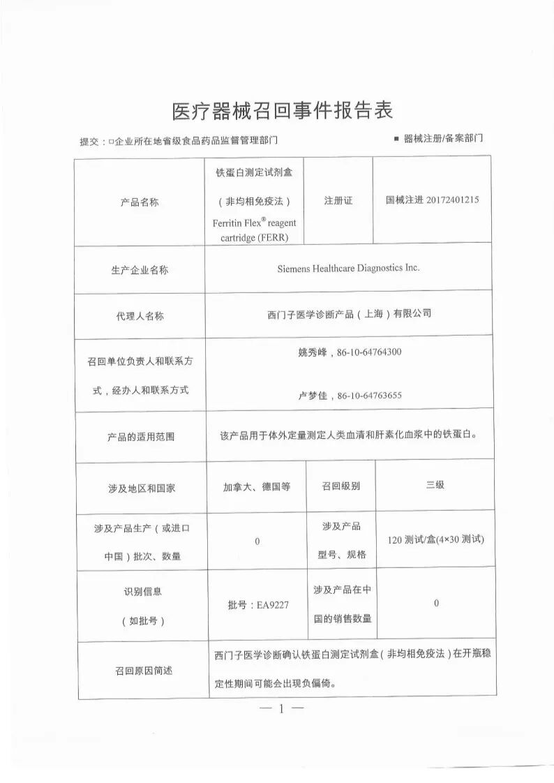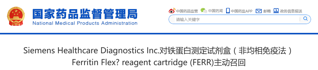西门子医学诊断产品(上海)有限公司报告,由于涉及产品存在,生产商Siemens Healthcare Diagnostics Inc.对铁蛋白测定试剂盒(非均相免疫法)Ferritin Flex? reagent cartridge (FERR)(国械注进20172401215)主动召回。召回级别为三级。