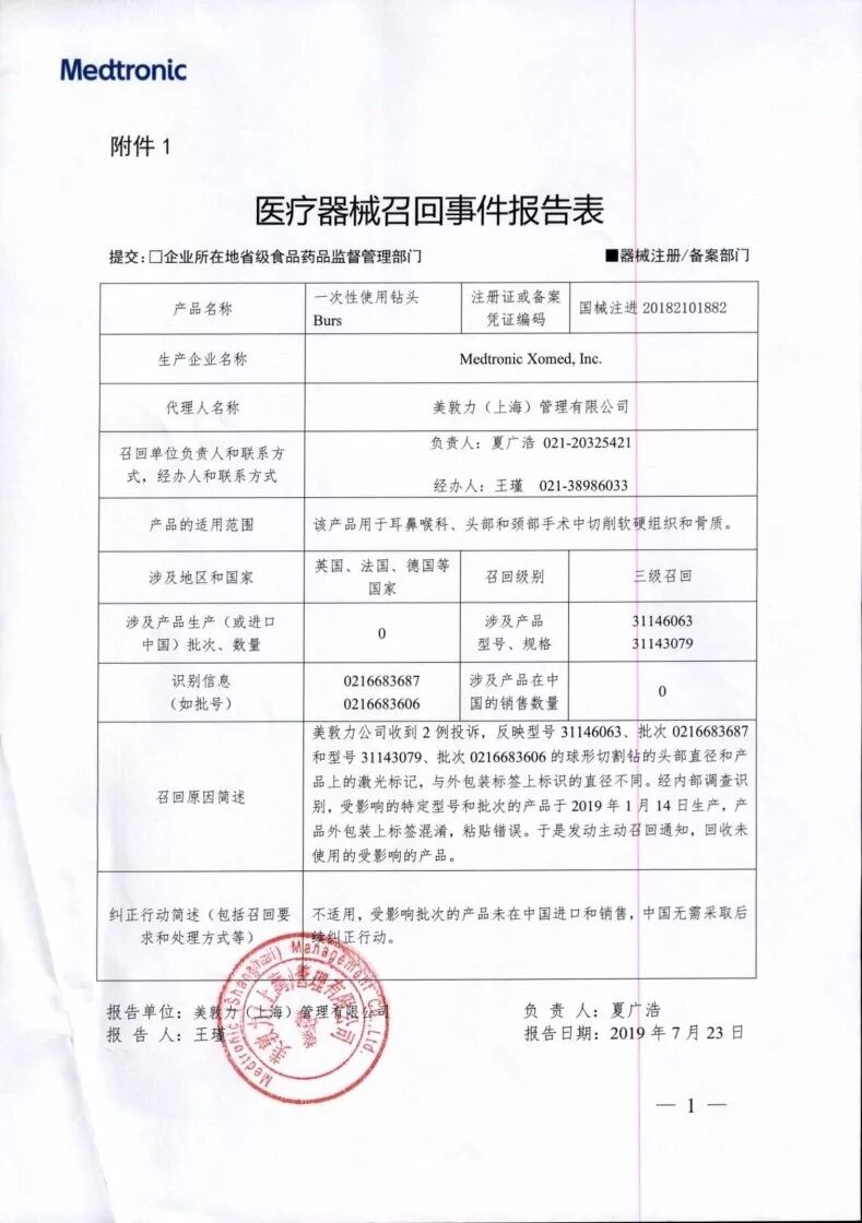 美敦力(上海)管理有限公司报告,由于涉及产品存在部分批次产品直径与外包装标签不一致的问题,生产商Medtronic Xomed, Inc.对一次性使用钻头Burs(国械注进20182101882)主动召回。召回级别为三级。