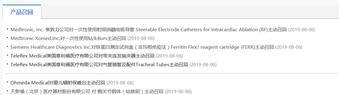 除此之外,8月6日国家药监局连发的8条医疗器械召回通告中。美敦力、西门子也有一批医疗器械产品集体召回。