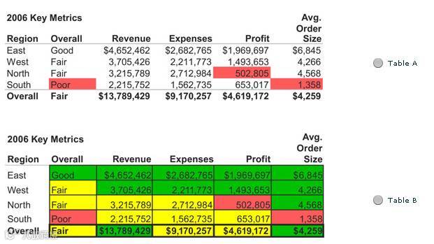 点评:我们应该选择上面的,因为网格线会让我们看不清晰,最好不要用网格线;当然颜色也是非常重要的,记住条件格式的应用,别一点一点的把数值变字体颜色,要用规则变;当然细节也是非常重要的,比如字体、数值、对齐等格式问题,这些都有助于领导欣赏!