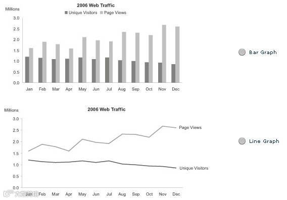 点评:选择下面的最重要的是X轴是时间,时间序列,所以折线图更能够感知的趋势、模式的变化!当然如果你表现的是不同品牌的市场份额,条形图或直方图也是可以的!