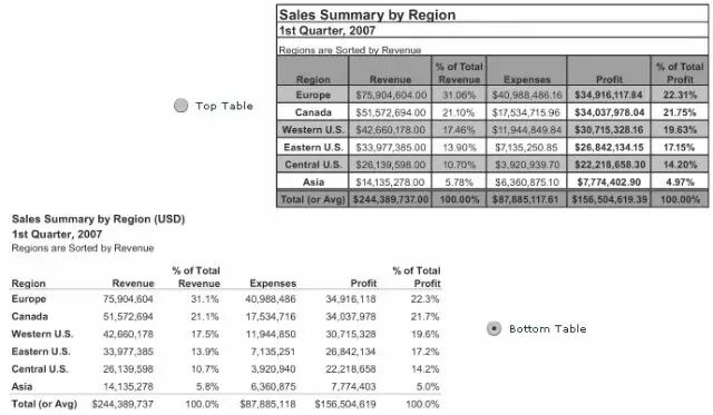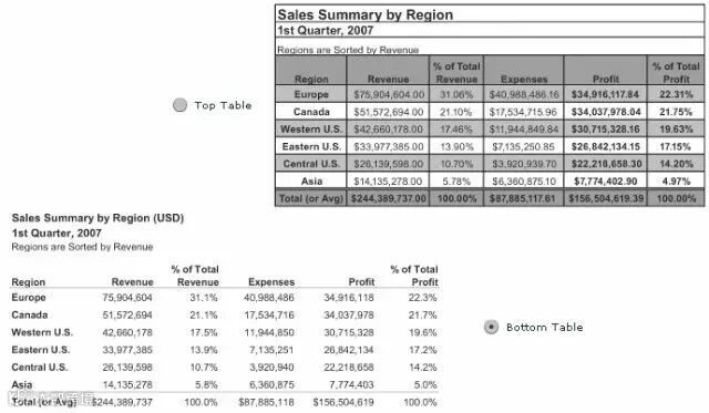 点评:简约就是美,显然下面的更清晰明快!我们习惯采用中国式图表,一般都是封闭边框线的,但是我们如果经常看英文的论文,你会发现很多论文都是下面的图表!在文章中,大家最好让表格内字体小于正文1个字号,保持非封闭的表格会有不一样的视角效果,似乎更显专业水准!当然中西文化的差异也可能存在不同观点!