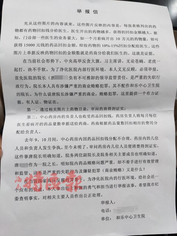 举报信中提到,医院院长唐某负有不可推卸的领导监管责任,是严重的失职行为,院长本人涉嫌商业贿赂,对乱象不作为。