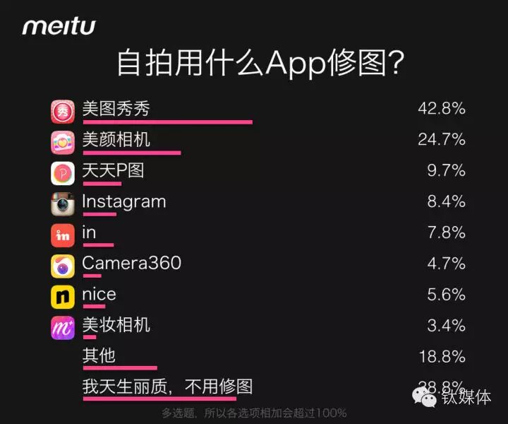而在对于“00后”都用什么App修图时,排在前三的答案分别是:美图秀秀、“我天生丽质,不用修图”和美颜相机。其中“我天生丽质,不用修图”的答案竟然超越了著名照片App Instagram位列第二。