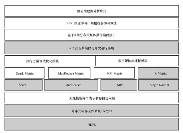 然而,目前的RHadoop和SparkR都还存在一个同样的问题:仍要求用户熟悉MapReduce或SparkRDD的编程框架和程序结构,然后将自己的MapReduce或Spark程序实现到基于R的编程接口上,这和在Hadoop或Spark上写应用程序没有太大的区别,只是编程接口用R语言封装了一下。此外,这些工作都是基于单一平台,无法解决跨平台统一大数据机器学习算法设计的问题。