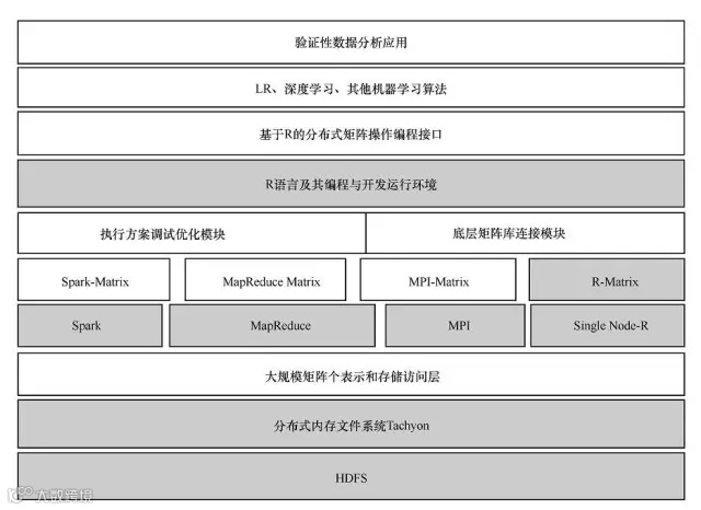基于矩阵模型的抽象基于这样一个事实:大多数机器学习和数据分析算法都可以表示为矩阵或向量代数计算,因此可以构建一个基于矩阵计算模型的机器学习系统,允许程序员直接基于矩阵计算快速构建机器学习和数据分析算法。最典型的基于矩阵模型的大数据机器学习系统尚不多见,UCBerkeley AMP Lab推出的Spark MLlib是一个试图基于矩阵计算模型构建上层各种机器学习算法的系统;最近Spark系统提出了一个DataFrame的数据抽象机制,允许基于矩阵和表等数据结构,设计各种机器学习和数据分析算法。此外,国内由南京大学PASA大数据实验室研究开发的“Octopus(大章鱼)”系统是一个以大规模矩阵模型为中心的跨平台大数据机器学习系统。