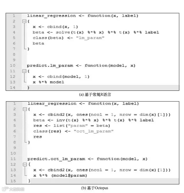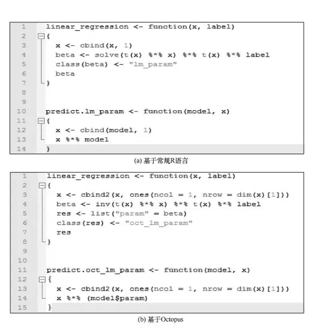 图7 基于Octopus和常规R语言的Linear Regresssion算法代码比较
