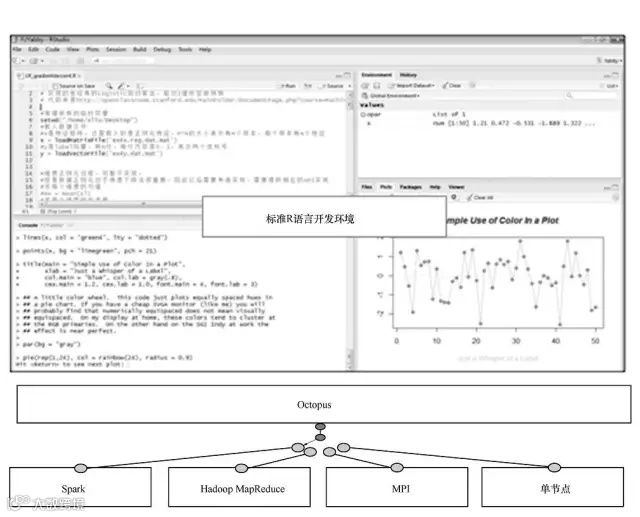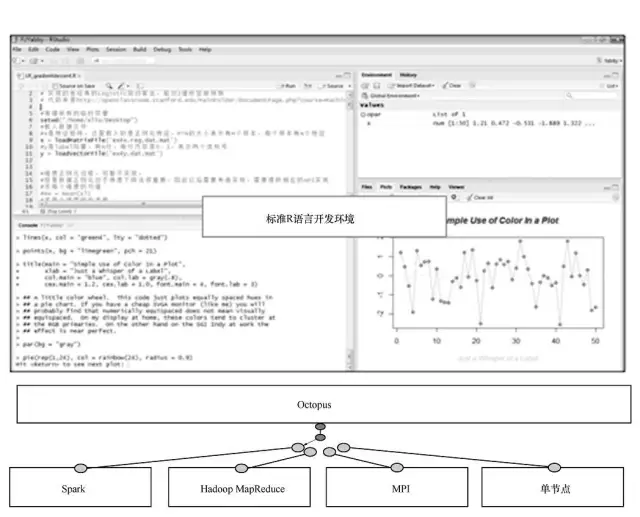 图6显示了Octopus系统的使用方式。Octopus使用标准的R编程和开发环境,允许用户使用R语言,并基于大规模矩阵计算模型编写各种机器学习和数据分析算法。系统可实现与Spark、HadoopMapReduce和MPI的集成,底层可无缝切换运行于不同的大数据平台上。基于Octopus所设计实现的算法或程序代码,无需修改即可平滑切换并运行于上述任意一个底层大数据计算引擎和平台上,只要简单地修改程序代码中的计算引擎类型选择参数即可。