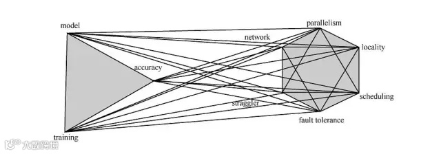 如图1所示,一个大数据机器学习系统会同时涉及机器学习和大数据处理两方面的诸多复杂技术问题,包括机器学习方面的模型、训练、精度问题以及大数据处理方面的分布式存储、并行化计算、网络通信、局部性计算、任务调度、容错等诸多因素。这些因素互相影响,交织在一起,大大增加了系统设计的复杂性。因此,大数据机器学习已经不仅仅是一个算法研究问题,而是需要针对大数据集,考虑从底层的大数据分布存储到中层的大数据并行化计算,再到上层的机器学习算法,设计一种一体化的支撑系统,形成易于为数据分析程序员和机器学习研究者使用的、完整的大数据机器学习系统。