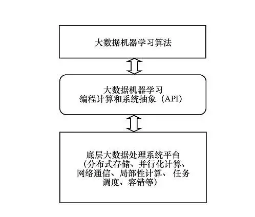 在上述技术特征中,一个非常重要的思路是,要通过系统抽象来降低系统设计的复杂性。如图2所示,一个设计良好的大数据机器学习系统,应当通过定义特定的机器学习编程计算和系统抽象接口,将上层机器学习和底层分布式系统解耦开来,将机器学习实现在现有的大数据计算平台之上,而不需要考虑底层系统层面的因素,以此实现底层大数据处理平台对上层用户的透明化,让上层用户从诸多底层的分布和并行化大数据编程计算细节中解放出来,以便他们致力于上层的机器学习模型和算法的设计实现。通过编程计算和系统抽象层API,向上提供各种机器学习编程计算接口以及学习模型和训练数据的表示,向下由底层分布式系统负责处理并提供高效的分布和并行化计算实现。