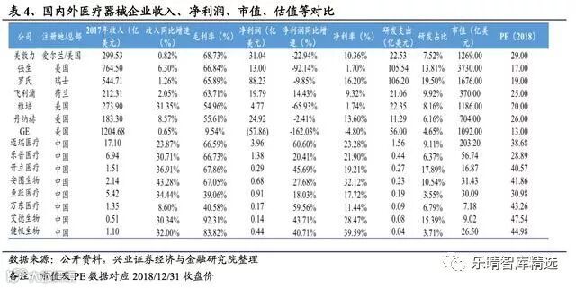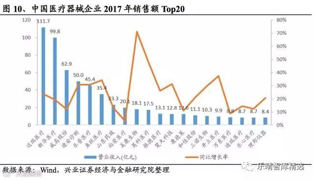 2017年,营业收入最高的三家公司为迈瑞医疗(111.7亿人民币)、新华医疗(99.8亿人民币)和威高股份(62.9亿人民币),与国际医疗器械龙头美敦力(300亿美元)、强生(266亿美元)和雅培(160亿美元)等公司相比具有较大的差距。