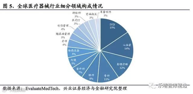 医疗器械行业细分领域众多,具体来看,2017年全球前15大医疗器械种类销售额达3420亿美元,合计市场规模占比为84.40%,预计2024年可达5017亿美元。