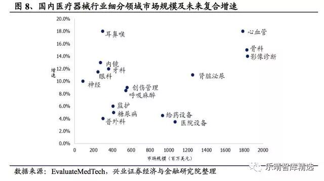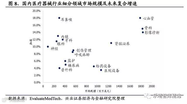 从全球医疗器械细分领域的增速来看,神经科和糖尿病管理未来几年的增速最高,分别为9.1%和7.8%;从国内细分领域增速来看,耳鼻喉及心血管的增速最高,约达到18%。