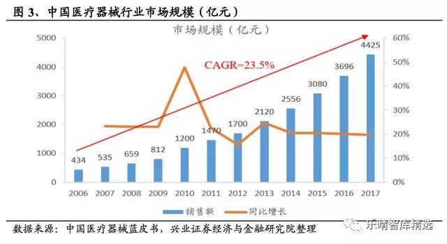 我国医疗器械行业规模从2006年的434亿元增长至2017年的4425亿元,年均复合增长率约为23.50%,行业正处于快速发展期。