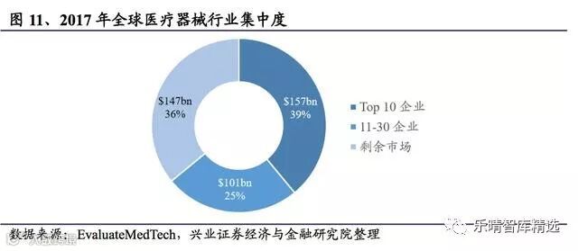 2017年前10大器械企业市场份额占比约为39%,前20大器械企业市场份额占比约为54.5%,前30大器械企业市场份额占比约为64%。