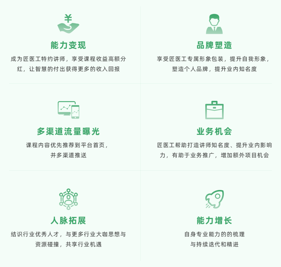 匠医工拥有课程直播、录播、联合打造“筑匠计划”系列课程等多种授课方式,可供讲师自由选择。详情可联系客服了解,匠医工团队将全力协助您优选最合适的模式,开展课程。