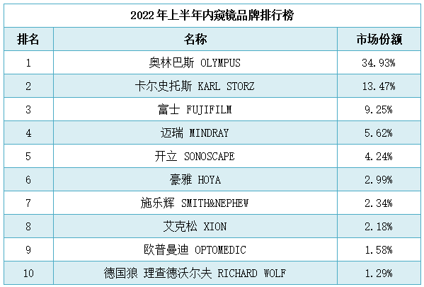 据了解8月14日,众成医械大数据平台统计,2022年上半年内窥镜市场排行榜十已公布出来,其中迈瑞、开立位居排行榜前五。