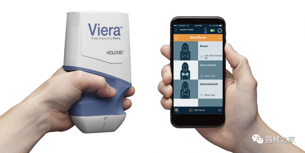 POCUS进入乳房成像的另一个例子是2018年Hologic新推出的Viera™便携式乳房超声系统。无线超声扫描仪为医生提供了早期诊断和优化临床工作流程的机会。它可以指导介入程序,如活组织检查,标记放置和电线本地化。它还可以将乳房图像传输到智能设备或PACS。