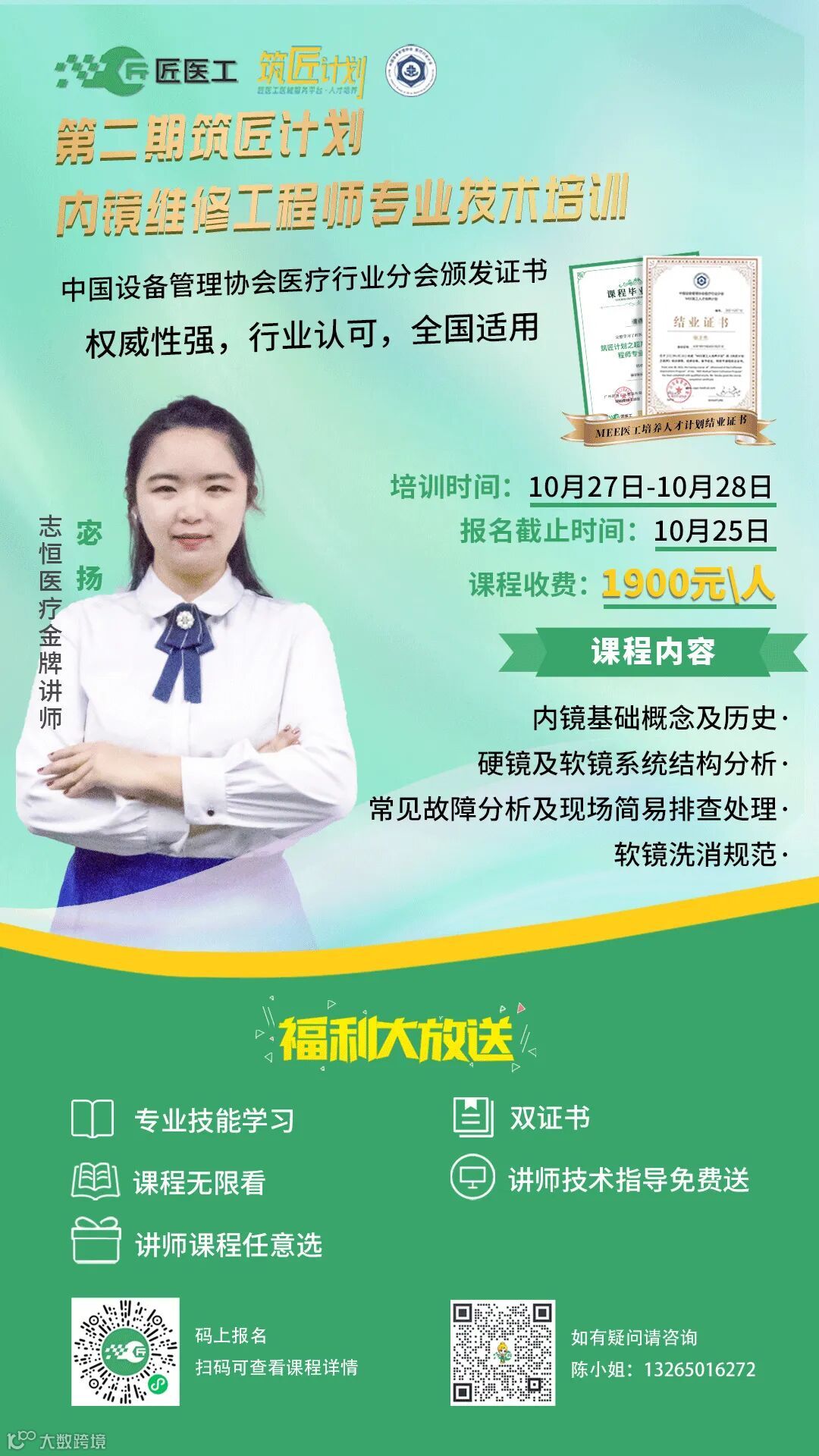 课程学习完毕即可获得匠医工平台颁发的课程毕业证书、考核通过更可获得中国设备管理协会医疗行业分会颁发的结业证书
