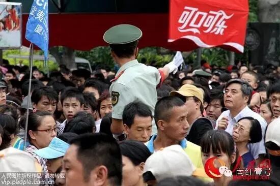 (往年国庆长假,在厦门鼓浪屿风景区渡口和厦门火车站,拥挤的人群众中不时可以看到身穿橄榄绿,手臂上戴着鲜红色执勤袖标的武警战士在忙碌。才一天下来,战士小张就已喊得嗓音沙哑。 摄影 黄勋)