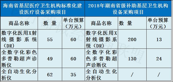 联盟菌对比去年8月湖南省发布的“2018年省级补助基层卫生机构设备(DR)采购项目”和“海南省基层医疗卫生机构标准化建设医疗设备采购项目”发现,相比湖南省DR、彩超2类设备创历史新低的单台预算价,云南省不再是“唯最低价”!但相比海南省,DR单台预算价低出41.7%,彩超低出1.5倍!