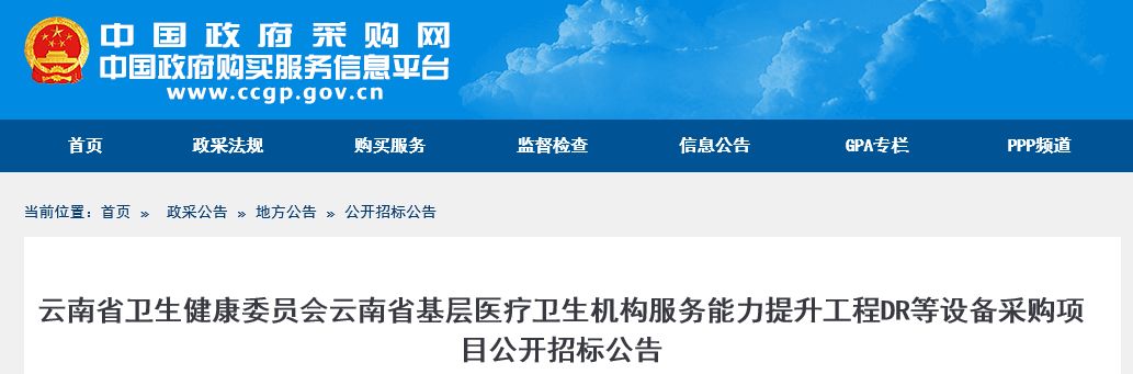 6月6日,中国政府采购网发布《云南省卫生健康委员会云南省基层医疗卫生机构服务能力提升工程DR等设备采购项目公开招标公告》。