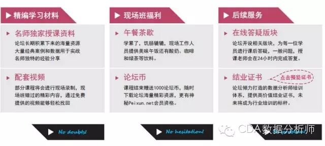 CDA数据分析师系统培训,由人大经济论坛根据CDA协会认证标准而设立的一套针对数据分析师技能的全面系统培训。培训师资目前均来自学界、实务界相关领域的讲师、教授、专家、工程师以及企业资深分析师,名师荟萃,代表了国内数据分析培训的最高水平,可以很好地保证培训的学员既能学到扎实的数据分析理论知识,又能具备较强的利用软件解决实际问题的能力,保证学员能胜任各行业数据分析师工作的要求。CDA数据分析师培训注重结合实际,把最具技术含量、最具价值理念的课程传授给学员。课程还注重启发式教学,让学员在解决问题的动手中去学习。