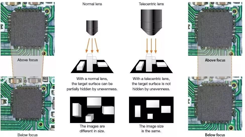 ▲远心光学系统和非远心光学系统的图像采集对比图