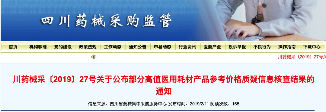 2月11日,四川省药械集中采购服务中心发布《关于公布部分高值医用耗材产品参考价格质疑信息核查结果的通知》(川药械采〔2019〕27号),公布了此前部分高值耗材挂网参考价公示期间遭受质疑的处理结果。共12家企业的38个高值耗材产品遭到举报质疑。