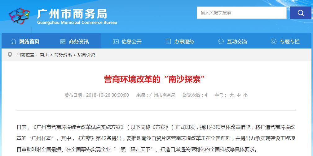 日前,《广州市营商环境综合改革试点实施方案》(以下简称《方案》)正式印发,提出43项具体改革措施,其中要推动南沙自贸片区营商环境改革走在全国前列,并提出力争实现建设工程项目审批时限全国最短、在全国率先实现企业“一照一码走天下”、打造口岸通关便利化的全国样板等具体要求。