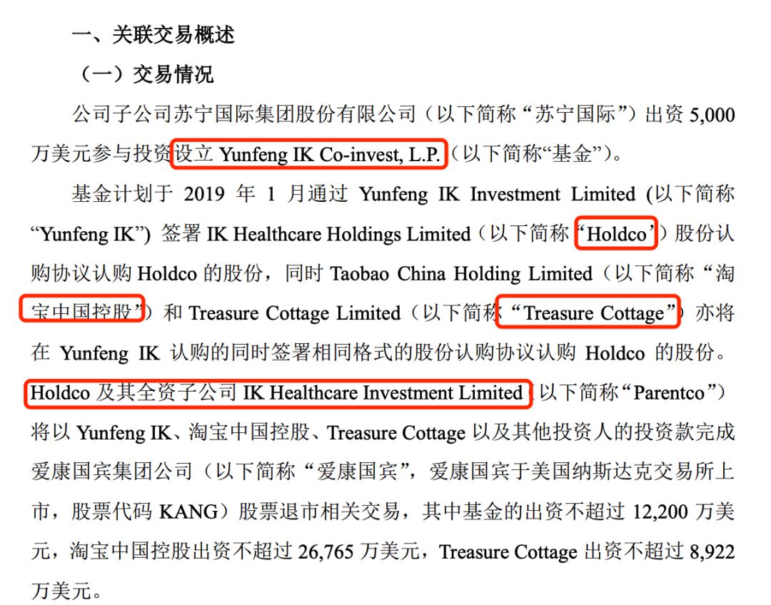 1月14日晚间,淘宝和苏宁等分别公告宣布,将通过多方出资,最终收购爱康国宾100%股份。爱康国宾私有化之后,阿里巴巴旗下淘宝中国控股和Treasure Cottage将间接持有爱康国宾约23.8%的股权,苏宁与云峰合作的基金将间接持有爱康国宾约8.2%的股权,苏宁国际间接持有爱康国宾约3.4%的股权。