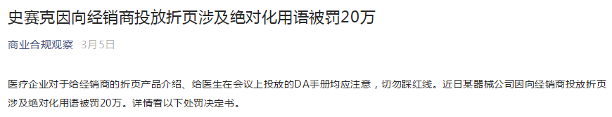 史赛克(北京)医疗器械有限公司因向经销商客户投放多份标题为史赛克“超声外科吸引系统”的医疗器械印刷品广告折页,该印刷品广告折页中含有“最先进的压电式马达”等广告宣传用语。涉嫌违反《广告法》中禁止使用绝对化用语,被罚20万。