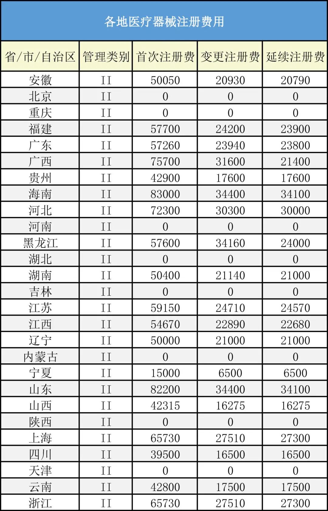 附:全国各省二类医疗器械注册费用一览表(截止2021年9月)