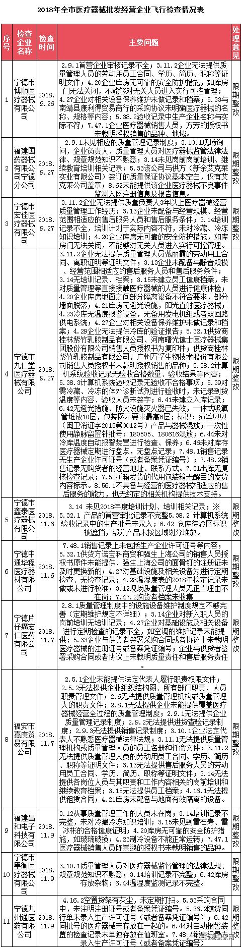 近日,福建省宁德市药监局发布《2018年全市医疗器械批发经营企业飞行检查情况表》。