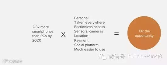 2020 年,智能手机数将达到 PC 的 2—3 倍,但乘以移动设备便携易用带来的便利,移动设备将能提供 10 倍于 PC 时代的机会。