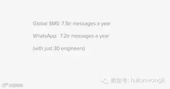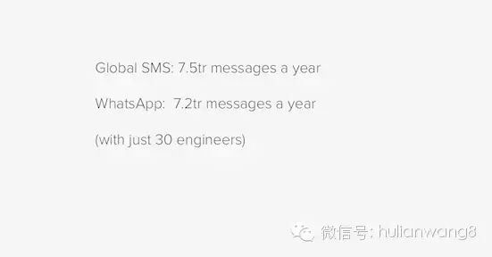 Facebook 和 WhatsApp 是最典型例子。两年内,Facebook 移动广告收入就翻倍,成为一个体量达 65 亿美金的海量客户部门;而只有 30 个工程师的 WhatsApp 一年内信息流量已达到 72 亿条,要知道,全球短信总量是每年 75 亿条。
