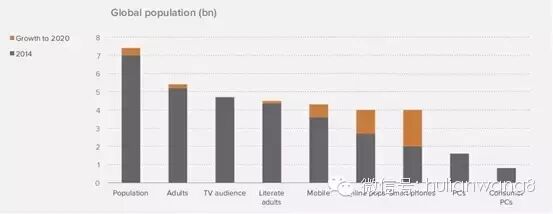 2020 年全球人口数在 74 亿左右;成年人数约 52 亿人次;TV 受众 48 亿左右;有文化和读写能力的人 45 亿左右;功能机用户 43 亿左右;上网人数 40 亿左右;智能手机用户 40 亿左右;PC 用户 17 亿;个人 PC 用户在 10 亿以下。