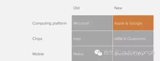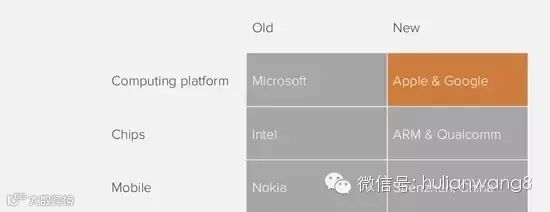 硅谷和中国成为新时代中心,代表公司:电脑领域谷歌和苹果,打败微软;芯片领域 ARM 和高通,打败英特尔;手机行业,中国深圳打败原生产诺基亚的芬兰。