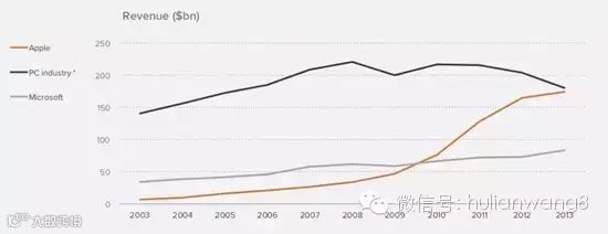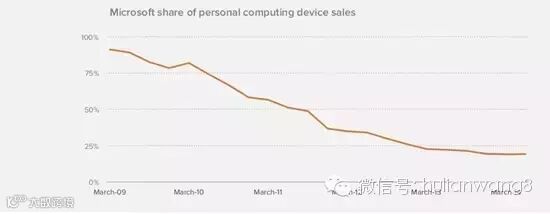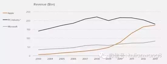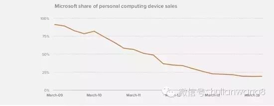 微软在 PC 领域销售份额持续下滑,已从超过 85% 份额,掉到不到 25%;而苹果却快速占领市场,从收入看,几乎接管 PC 业,在 2013 年达到 1750 亿美金。