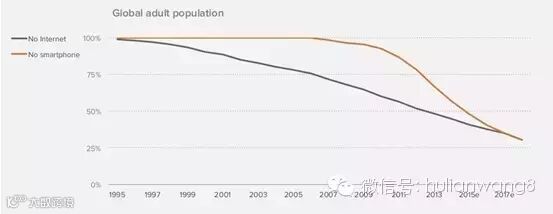4. 1995 年至今,不上网或没智能手机的成年人数持续收缩:前者从 1995 年近百分百降至 2017 年约 36%;后者从 1995 年百分百降至 2017 年约 28%。